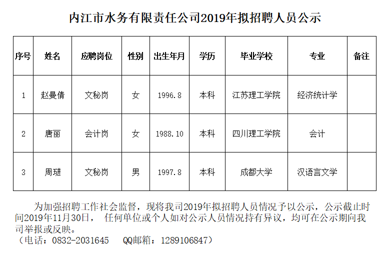 內江市水務(wù)有限責任公司2019年擬招聘人員公示