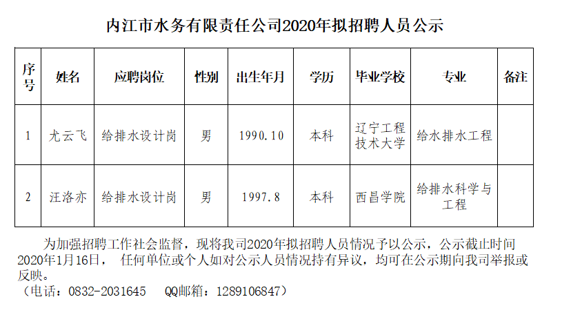 內江市水務(wù)有限責任公司2020年擬招聘人員公示