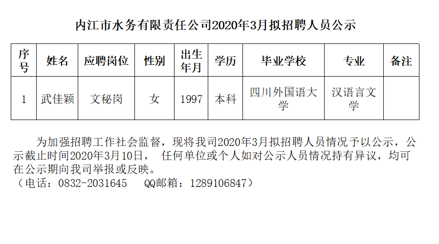 內江市水務(wù)有限責任公司2020年3月擬招聘人員公示