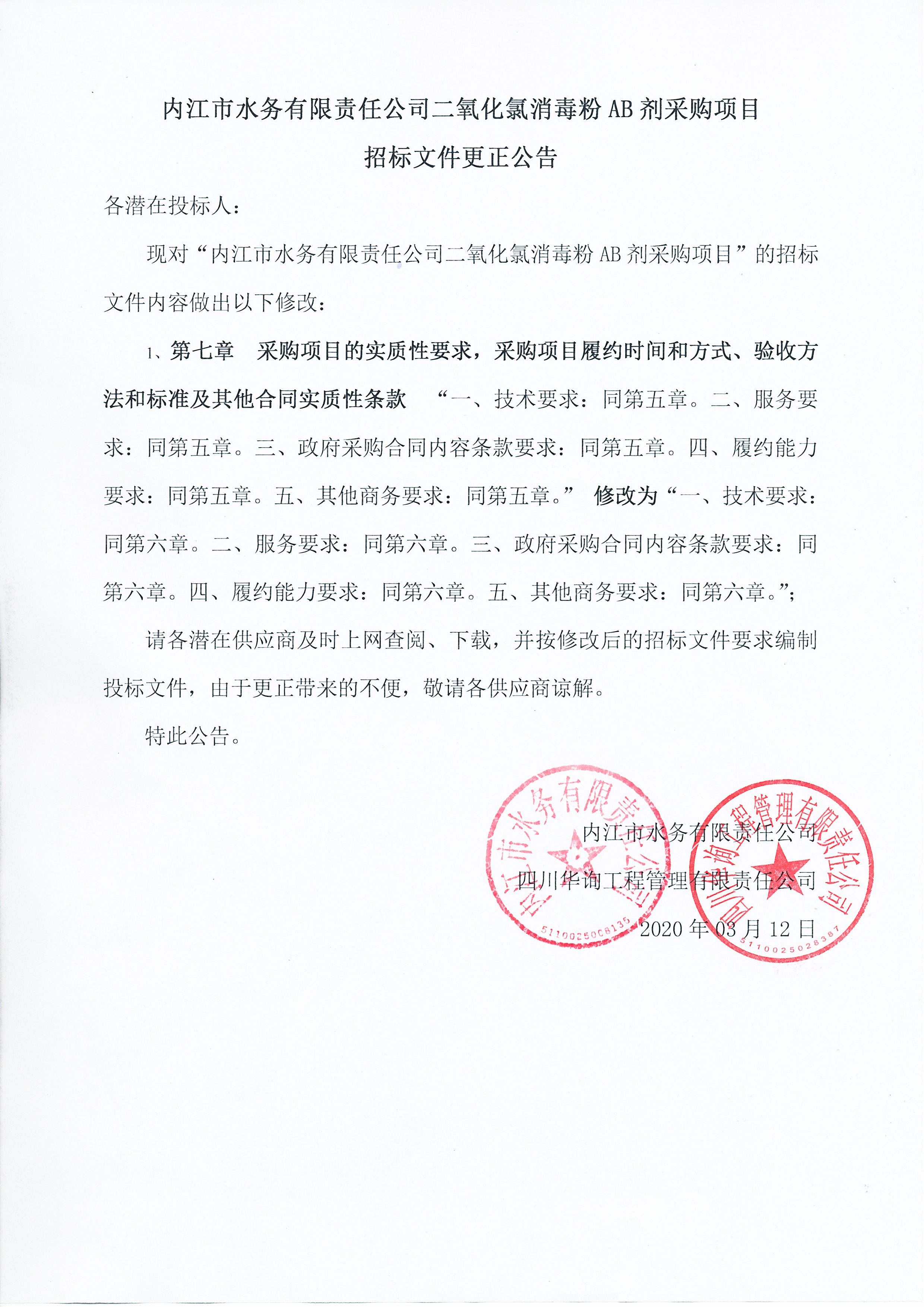 內江市水務(wù)有限責任公司二氧化氯消毒粉AB劑采購項目招標文件更正公告