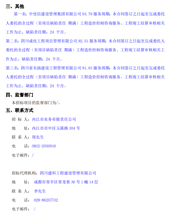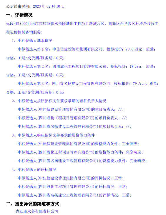 內江市應急供水搶險基地工程項目新城片區、高新區白馬園區標段全過(guò)程工程造價(jià)控制咨詢(xún)服務(wù)中標候選人公示