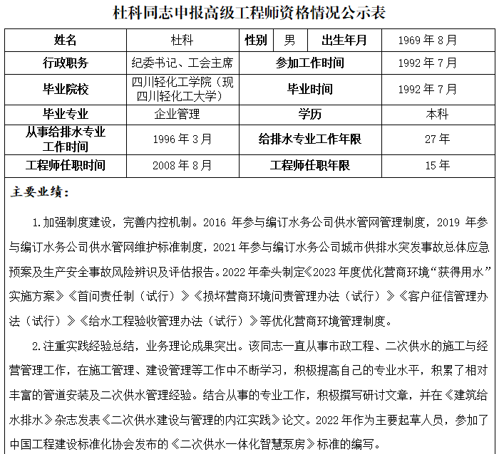 根據《四川省建設工程技術(shù)人員職稱(chēng)申報評審基本條件》(川建行規〔2023〕3號)的規定,經(jīng)審查,杜科同志符合申報條件。為體現公開(kāi)、公平、公正原則,接受社會(huì )公眾監督,現將其個(gè)人基本情況等材料予以公示,公示期為2023年10月7日至10月11日。如有不同意見(jiàn),請于公示期內,以書(shū)面形式向公司人力資源部反映。