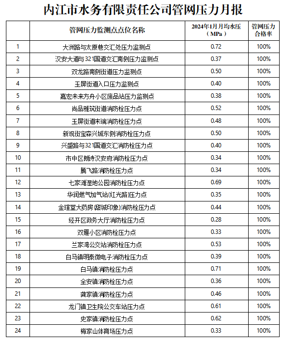 內江市水務(wù)有限責任公司2024年1月管網(wǎng)壓力月報
