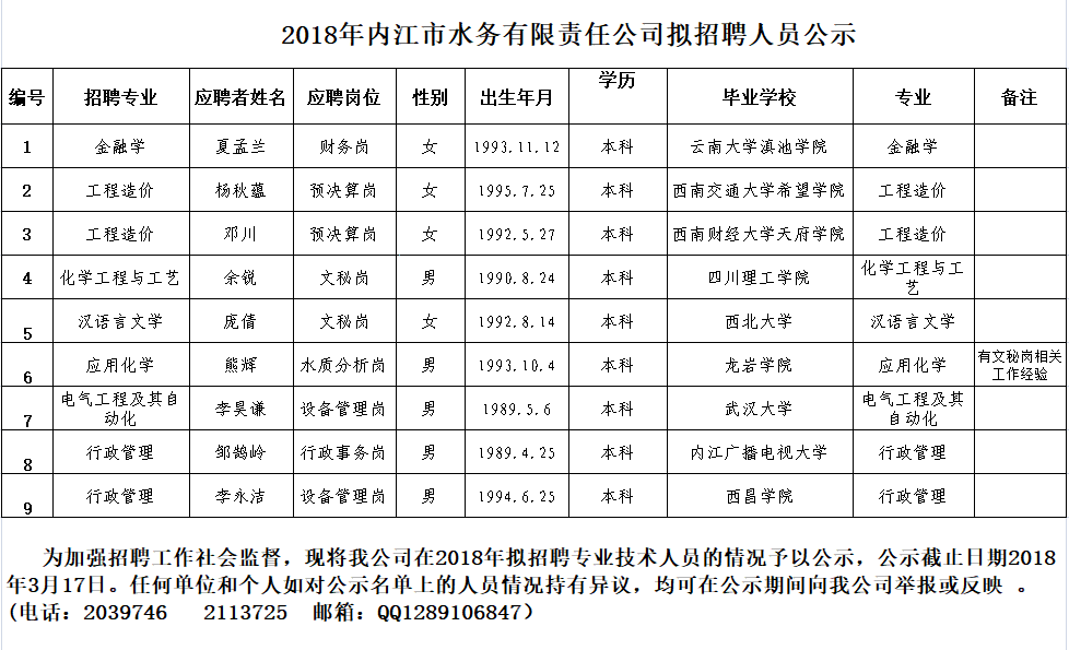 2018年內江市水務(wù)有限責任公司擬招聘人員公示